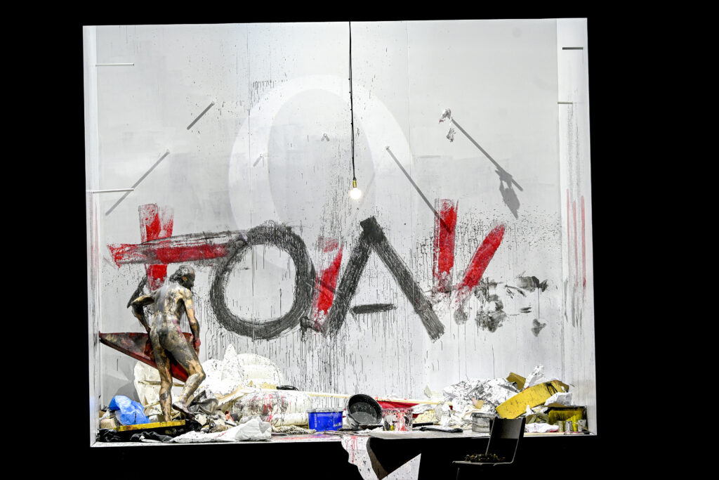 Man habe sich gefragt, was Moses eigentlich auf dem Berg Sinai mache, während unter Duldung seines Bruders Aron das Volk die alten bildhaften Götzen verehre. Theologisch geht es um die Genese des Bilderverbots („Du sollst Dir kein Bildnis machen“) und der monotheistischen Religion. Dietrich Henschel gibt in Bonn die Figur des Moses als Künstler, nicht als Religionsstifter. Man sieht ihn in einem quaderförmigen Aktionsraum, in den von oben Müll herunterfällt, das er als Material für seine Performance nutzt. Joseph Beuys, dessen Aktion „I like America and America likes Me“ einmal sogar zitiert wird, lässt grüßen. Diese wilde auch wütende Performance mündet in ein action painting. Moses ringt körperlich sich entäußernd mit seinem Gott, der als baumelnde Glühbirne dargestellt ist, um dessen Gesetz in Form von Wörtern und Schriftzeichen zu fassen, bis er ganz nackt seinen Körper als Fläche für die Gesetzestafeln benutzt, ohne 20 Minuten lang überhaupt einen Ton von sich zu geben, denn laut Partitur ist er ja gar nicht anwesend.