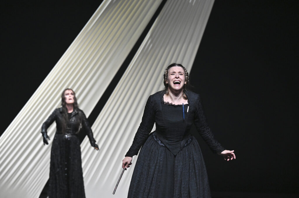Nur in der Mitte hat der Bühnenbildner Flurin Borg Madsen Latexbahnen gespannt, die später reißen und eine überdrehte, zu fest angezogene Schraube symbolisieren sollen. Die Geisterwesen Quint und Miss Jessel sprühen vor jedem Auftritt selbst etwas Nebel in die Szene. Bei Szenenwechseln huschen die Protagonisten wie ferngesteuert auf die Bühne und sortieren sich auf ihren Auftrittspositionen. Und die Szenenwechsel selbst werden durch harte Lichtschnitte markiert exakt parallel zur musikalischen Gliederung, bei der vor jeder Szene ein Zwischenspiel platziert ist.