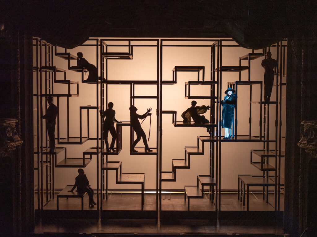 Die Bühne von Rebecca Ringst passt scheinbar gar nicht zu Koskys Operettenstil: Die ersten Szenen spielen vor einem Glitzervorhang – immerhin – aber wie in einem Kammerspiel, später sieht man eine Art vertikales Labyrinth, ein verwinkeltes Klettergerüst, auf dem die Darsteller herumturnen. Und als Mackie Messer gefangengenommen wird, ist eine lange Eisenkette, die geräuschvoll zum Perkussionsinstrument mutiert, das Hauptrequisit. Was auf den ersten Blick sparsam aussieht, ist in Wirklichkeit eine ideale Spielfläche für Koskys theatrale Vorlieben, z. B. das beiläufige Zurschaustellen von sexuellen Präferenzen, indem Mackie Messer mit dem Kettenfetisch sich von Frau Peachum „dominieren“ lässt, bei der nie klar wird, was sie eigentlich unter ihrem Pelzmantel trägt (Kostüme: Dinah Ehm).