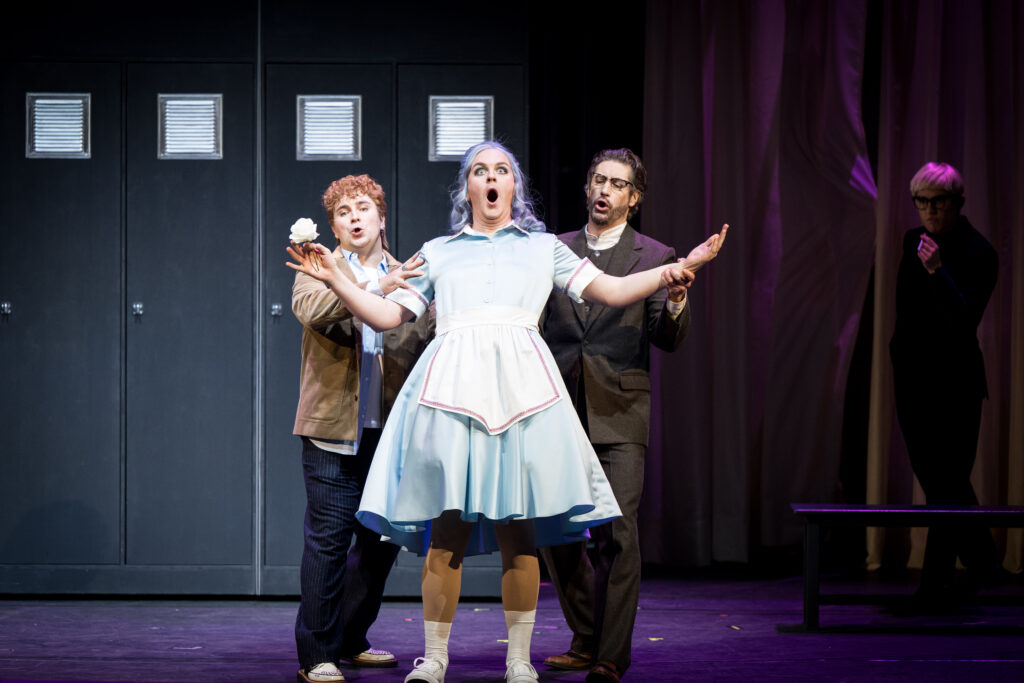 Das Stück heißt im Untertitel „Ballet Bouffon“, was wohl für den Choreografen Anlass und Legitimation war, daraus fast ein durchgehendes Handlungsballett zu machen. Besagtes Voguing, ein New Yorker Tanzstil, bei dem Modelposen aus der Modezeitschrift rhythmisiert werden, performen z. B. 4 Tänzerinnen und Tänzer, die ständig um Platée herum sind und ihr Innenleben verkörpern, von unbändiger zappeliger Freude bis zu drängender Ungeduld. Die anderen acht aus der Kompagnie – nicht minder virtuos – treten mal als Matrix-Soldatinnen auf, mal im barocken Tüll mit Federfächern als Entourage von La Folie, eine Art Zeremonienmeisterin eines in die Handlung eingeschobenen Divertissements, das wie ein Einsprengsel wirkt, von Rameau aber mit einer großen Sopranrolle bedacht wurde.