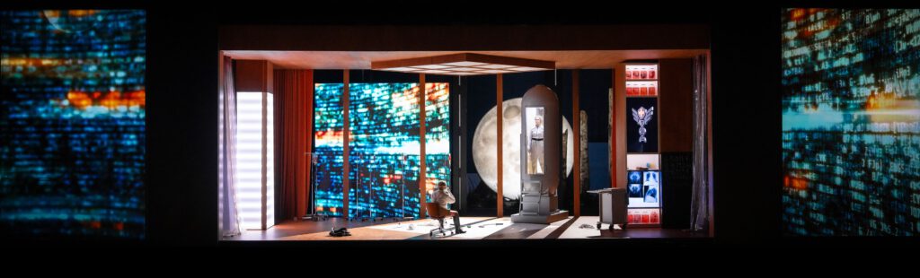 Wotan ist hier und später im dritten Aufzug ein unbeherrschter Wüterich, der die Einrichtungsgegenstände umherwirft und von Brünnhilde nur mühsam beruhigt werden kann. Trine Møller erscheint erst als puppenartiges Wesen mit Kinderrock und langem blonden Haar, die sich an Wotan kuschelt. Als er den Befehl erteilt, Siegmund den Schutz zu entziehen, schneidet sie sich die Haare und erscheint fortan als Kämpfer-Figur, die einem Science-Fiction-Film entstiegen sein könnte und ihre Schwerter auf dem Rücken trägt. Sie hat aber nichts Martialisches in ihrer Stimme, sondern ein angenehmes, flexibles Timbre, mit der sie die Mischung aus kindlicher Zugewandtheit und energischer Positur gut umsetzt, etwa in der sich anschließenden Todesverkündung an Siegmund: „Nur Todgeweihten taugt mein Blick“. Inzwischen hat sich der rote Vorhang geöffnet, und man blickt wie schon im ersten Aufzug in eine dystopische Landschaft mit einer riesigen Mondscheibe, die sich hier bläulich einfärbt, vorher fahl weiß, oder, wenn es besonders emotional wurde, auch rötlich schien, eine vielleicht etwas platte Lichtregie angesichts der ansonsten von Pia Dederichs und Lena Schmid aufwendig gestalteten Bühne. Im ersten Aufzug wird eine primitive Behausung von Hunding, umgeben von abgestorbenen Baumstämmen und futuristischen Stelen, gezeigt. Rechts und links sind hier (wie auch später) riesige Videoleinwände aufgebaut, in die manchmal Bilder von Überwachungskameras eingespielt werden oder, jeweils zu Beginn beim Hereinkommen des Publikums in den Saal, Bildschleifen wie das Durchstreifen eines Waldes mit Bodycam oder kriegszerstörte Städte. Später im dritten Aufzug erweitern diese Videowände die Bühnenbreite, indem dort die das Labor beherrschenden Datenströme visualisiert werden.